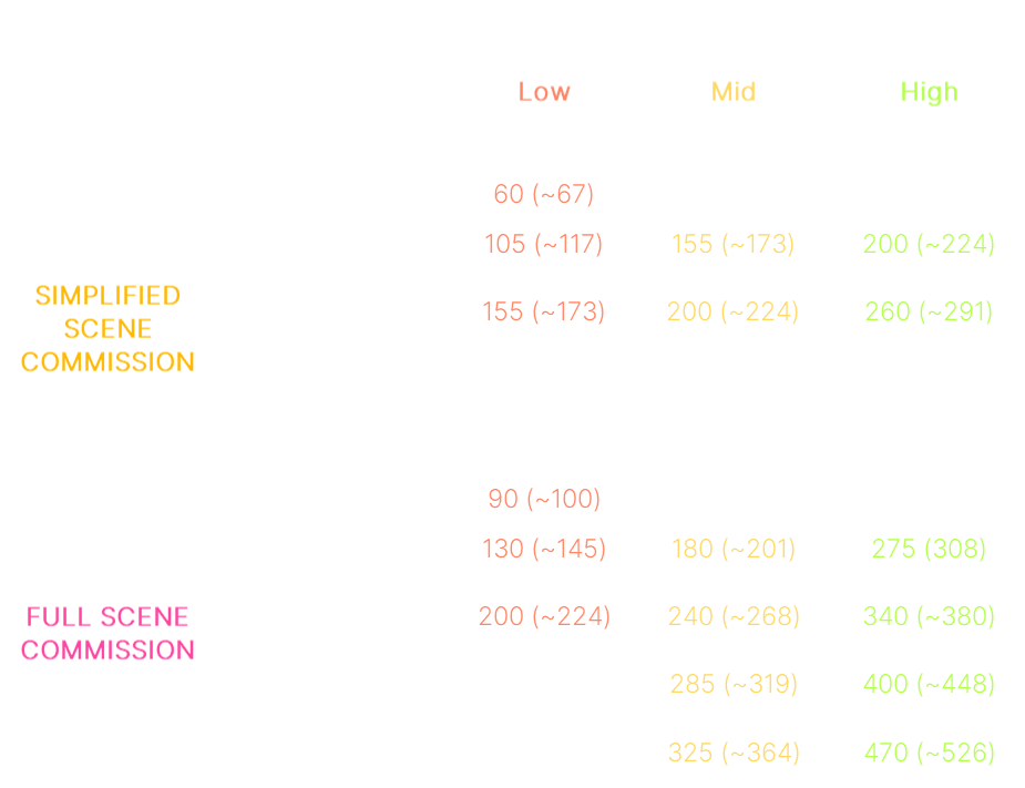 Below are the basic prices for all types of scene commission pieces with all levels of background detail and examples without the service fees applied. Please don't forget about the 12% increase, it is calculated for each price in the table below.Please note that depending on your background idea complexity, the price of your commission might be increased. The background complexity multiplier table can be found later on this page. (Updated 3/24/2026)The used colors mean low, medium and high for background detail level.β€ SIMPLIFIED SCENE COMMISSIONS (portraits (bust-up) and half bodies (waist-up) are available):