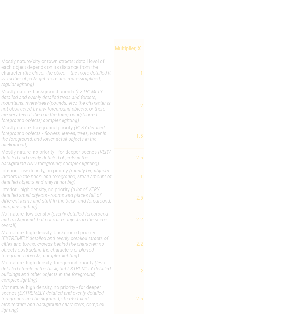 β¨ Background complexity multiplier table. You can compare your idea to the ones in the Description column, or ask me if you're not sure. Those multipliers are intended to make the prices fair for everyone: for you to not overpay for simpler ideas and for me to get fair payment for really complex scenes that take many hours of work. (Updated 3/24/2026). Please zoom in if you're on mobile.