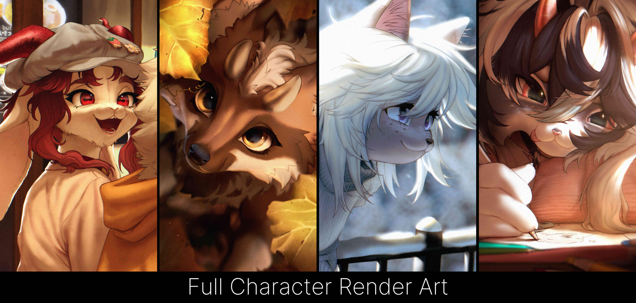 β Full oc render: $85 (~$95 after fees) for a 1-character order and $160 (~$180 after fees) for a 2-character matching PFP order.A single character profile picture art will be a PNG, 4000x4000px 300dpi (8000x8000px 300dpi - then split, for 2 characters respectively) by default and can be resized to any requested resolution lower than the original one (for example, 100x100px for Furaffinity). Your character(s) will be cropped at shoulder level, or with just their face visible. Any facial expression, camera angle and head tilt, side/profile view variation you want, same for when it's a matching piece. Paws and some props can be included (always free).The background choice is limited to: